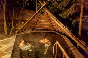 庭園縄文風呂は、つなぎ温泉の西に位置する貴重な遺跡群「萪内(しだない)遺跡」をモチーフにしたお風呂。