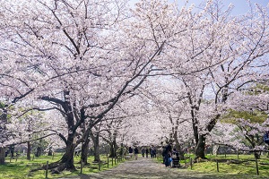 ソメイヨシノが多く植えられている桜園では、桜に包まれた空間を楽しめます。