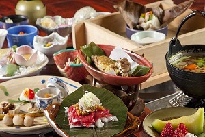 夕食は、地元の食材をふんだんにとり入れた温泉せいろ蒸しいろり会席。