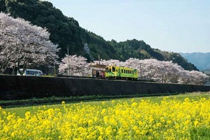 錦川の清流を眺めながら列車は上流へと進み、途中、南河内駅付近では菜の花と桜のコントラストを楽しめます。