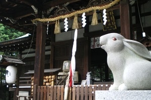 狛犬ならぬ狛うさぎがお出迎え。右側の阿形がオスで、左側の吽形がメス。それぞれの頭をなでることで、縁結びや夫婦和合のご利益があるといわれています。