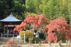 大小2本の幹が白くねじ曲がり、ところどころにコブができ、イロハカエデです。枝が枝垂れて傘を広げたような樹形は突然変異によるものと考えられており、学問的にも貴重な樹木として国の天然記念物に指定されています。