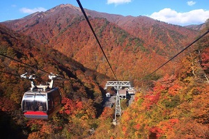 途中のロープウェイからは、谷川岳山頂へ続く山裾に広がる紅葉の絶景が楽しめます。紅葉の時期は標高によって異なり、天神平駅付近が9月下旬~10月上旬、天神平駅から土合口駅が10月中旬~下旬です。