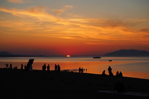 宍道湖(しんじこ)夕日スポットは、宍道湖に沈む夕日が、嫁ヶ島とともに見える絶景ポイントに、湖沿いを歩ける歩道や腰掛けて夕日を楽しむことができるテラスなどが整備された場所です。