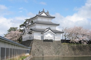 新発田城は一般に多くある山城とちがって、政治・経済の中心として交通の便利さを考え、平地につくった平城です。石垣がすき間なくかみ合うようにきちんと積まれる「切込はぎ」と呼ばれる美観を重視した技法でつくられ、白と黒が美しい海鼠(なまこ)壁で仕上げられています。 春の桜の季節、真冬の雪をすっぽりかぶった様子、四季折々の風情があります。