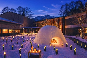 界 アルプスでは雪が積もると中庭に巨大なかまくらが登場します(1月中旬~2月中旬)。