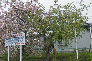 滝沢市の土日ジャンボ市の駐車場には、珍しい緑色の桜「御衣黄桜(ぎょいこうざくら)」が植えられています。