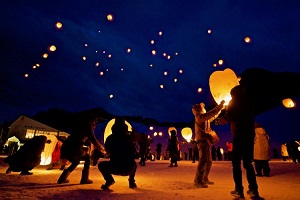 スカイランタンは、タイや台湾などアジア各地で通信手段、祈祷儀式として使われてきた熱気球で、雪景色の星空にあがるオレンジ色のランタンの灯りはとても幻想的。