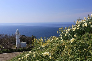 越前海岸の中では、東尋坊と同じく「日本の夕陽百選」にも選ばれています。岬からの眺望はすばらしく、展望台からは、東尋坊や敦賀半島を一望できます。岬の突端の海抜132mの頂上部には、白亜の越前岬灯台が立ち、岬のシンボルとなっています。この一帯は越前水仙の群生地でもあり、12~1月のシーズンともなれば、日本海を背景にして可憐な越前水仙の花々が咲き誇り、越前海岸ならではの美しい景色が広がります。
