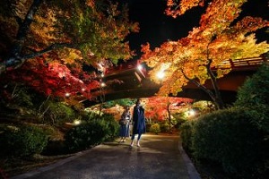朱色の観月橋と真っ赤な紅葉、広い夜空に浮かぶ月…昼間とは違う幻想的な雰囲気です。