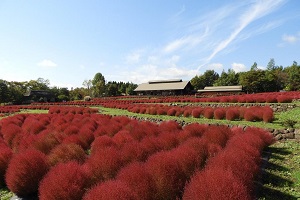 彩のひろばやでは、秋にはコキアとコスモスが一面に広がる風景が見られます。