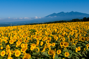 明野は日照時間が日本一長いといわれ、太陽の光をめいっぱいに浴びて育ったひまわりが壮大なスケールで咲いています。