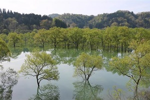 山形県飯豊町の白川湖では、毎年4月中旬から5月上旬にかけて雪解け水で湖面の水位が上昇し、ヤナギの水没林が現れます。