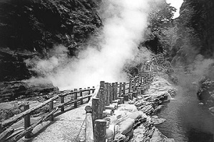 温泉蒸気が吹き上げる断崖「小安峡」