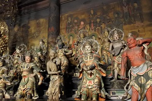 荘厳な堂内に本尊・千手観音や両脇侍仏の不動明王、降三世明王(こうざんぜみょうおう)が安置され、周囲に眷属の二十八部衆や風神・雷神がずらりと並ぶ様は圧巻です。