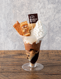 コーヒージュレ、チョコレートムースの上にローストしたクルミとサブレのパウダーを散らし、塩キャラメルとミルクのアイスを添え、クルミッ子をパフェとして再構築しました。