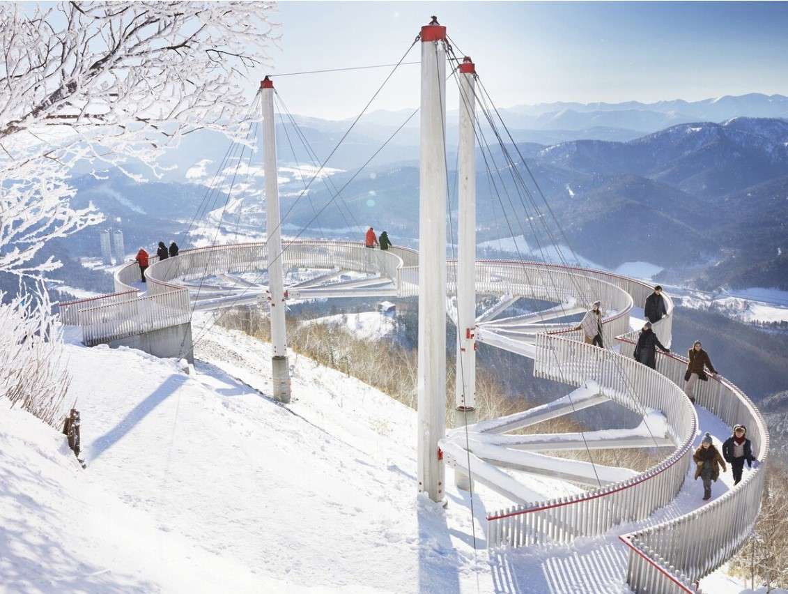 霧氷テラスは、トマム山の標高1,088メートルに位置し、木々に付着する霧氷がつくり出す絶景を観賞できるテラスです。