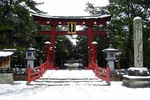 高さ約11mの大鳥居(重要文化財)は春日大社(奈良県)・厳島神社(広島県)と並ぶ日本三大木造大鳥居の一つ。