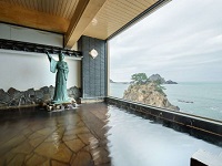 ホテル八乙女の屋上露天風呂からは日本海が見渡せ、夕方になると、日本海に沈む夕陽に、白山島が織り成すコントラストはまさに絶景です。