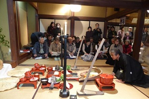 能登町の柳田植物公園では、かやぶきの古民家「合鹿庵(ごうろくあん)」でユネスコ無形文化遺産に登録された「アエノコト」が見学できます。 「アエノコト」は、毎年12月5日、一年間の収穫の感謝と次年度の五穀豊穣を祈願するため、田の神を家に案内してもてなす奥能登の民俗行事です。